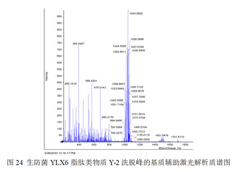 采用基质辅助激光解吸电离飞行时间质谱仪,对YLX6脂肽类物质纯化后获得的Y-2洗脱峰进行鉴定。从图24可以看出,在m/z 1008、1022和1036处有[(M+H)+]分子离子峰,且相差14 Da,即相差一个-CH2的分子量大小,分别与已知的C13-Surfactin、C14-Surfactin、C15 Surfactin分子量相同;在m/z 1043和1057处有[(M+H)+]分子离子峰,且这两种物质的分子量相差14 Da,分别与已知的C14-Iturin A和C15-Iturin A分子量相同。