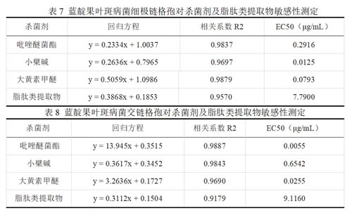 由表8可知:供试药剂对交链格孢菌株均有一定的抑制效果,其中,吡唑醚菌酯EC50最低,仅为0.0055 μg/mL,脂肽类提取物EC50最高,达到了9.1160 μg/mL。
