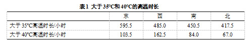 经统计分析发现,叶幕东侧大于35℃时长最长,依次分布是叶幕西侧、南侧、北侧,分别是595.5、485.0、450.5和417.5h,叶幕西侧大于40℃时长最长为162.5h,其次是叶幕东侧103.5h,北侧的最短是67.0h。表1
