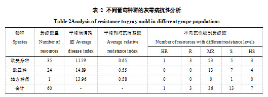 不同葡萄种群对灰霉病的抗性存在较大差异:35份欧美杂种葡萄资源中表现中度抗病(MR)及以上的种质共有27份,占比77.14%(27/35),平均病情指数为11.59,整体抗性较强;24份欧亚种葡萄种质资源中没有发现高抗 (HR)和抗病 (R) 种质,感病(S)种质和高感(HS)种质共计11份,占比45.83%(11/24),平均病情指数也高于欧美杂种,整体抗性较弱;地方种质资源郧西葡萄上灰霉病的病情指数为13.96,对灰霉病也较为敏感(表2)。
