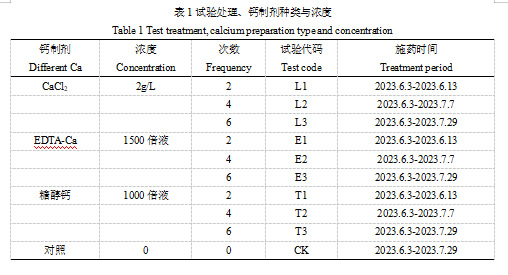本试验设置了三种不同类型的钙制剂,分别为CaCl2(2g/L)、EDTA螯合钙(1500倍液)、糖醇钙(1000倍液),以清水作为对照(CK)。其中,CaCl2溶液于实验室自配,EDTA-Ca和糖醇钙为市场购买。分别于盛花后十五天开始喷施,之后每隔10-15天喷施一次,共喷施六次。详细见表4-1。全部采用电动喷雾器进行喷施,着重喷施果实和叶片,直到自然滴水停止喷施。每个处理重复三株树。