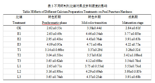 由表3可知,在转色前期时,E1、E2<E3, L1<L3,E3、T3、L3处理的效果最好;在转色中期时,T1、T2<T3,L1<L2、L3,E1、E2、E3、L2、L3处理的效果最好;在成熟期时,E1、E2<E3,L1<L2、L3,各处理均能显著提高果皮穿刺硬度,E3处理的效果最好。说明E3、L3提高果皮穿刺硬度的效果最好。
