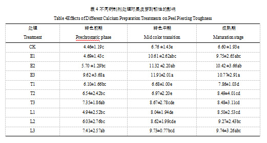 由表4可知,在转色前期时,E1、E2<E3,E3、T3、L3处理的效果最好;在转色中期时,E1、E2、E3、L3处理的效果最好;在成熟期时,各处理均可以显著增加果皮穿刺韧性,E1、E2、E3处理的效果最好。说明E3处理提高果皮穿刺韧性的效果最好。