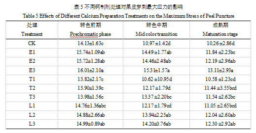 2.5 不同钙制剂处理对果皮穿刺最大应力的影响
