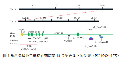 为了验证KASP_VviAGL11标记的基因型,采用常规PCR技术扩增位于Chr18: 26889269~26889678区域片段长度为410 bp 的DNA序列,然后进行桑格测序,以确认Chr18: 26889437位置的样本基因型与KASP_VviAGL11标记检测到的基因型一致。引物合成及测序由生工生物技术(上海)有限公司完成。