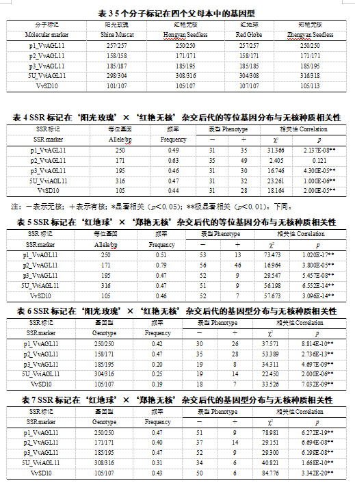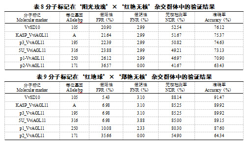 通过自然群体和‘阳光玫瑰’ב红艳无核’、‘红地球’ב郑艳无核’两个F1代杂交群体对6个无核分子标记进行验证,VvSD10和KASP_VviAGL11的无核鉴定准确率及无核检测率最高,综合表现最优,可作为辅助葡萄无核育种过程中的可靠标记。