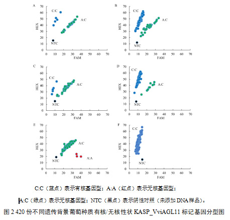 通过KASP标记对自然群体和两个杂交群体的F1代单株进行检测,KASP_VviAGL11检测到的A:A和A:C为无核基因型,C:C为有核基因型。如图2所示,KASP_VviAGL11标记在‘阳光玫瑰’ב红艳无核’杂交群体中的35份无核种质(A图)和99份有核种质(B图)中分别扩增出31个A:C基因型和70个C:C基因型;在‘红地球’ב郑艳无核’杂交群体中的56份无核种质(C图)和73份有核种质(D图)中分别扩增出52个A:C基因型和64个C:C基因型。在由157份二倍体葡萄种质组成自然群体中,68份无核种质(E图)均检测到A等位基因,基因型为A:C和A:A;89份有核种质(F图)均检测到C等位基因,基因型为C:C。