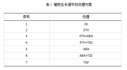 植物生长调节剂处理为叶面喷施ABA(100mg/kg)、ETH(有效成分40%,500mg/kg)和TDZ(2mg/kg)等促落叶物质。共设置6个处理(详见表1),每处理 5 株,叶面喷施,以喷清水为对照。试验处理时间为9月末(果实采收后)。