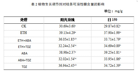 由表2可知,所有处理下‘阳光玫瑰’和‘日150’枝条中可溶性糖含量均高于对照。在‘阳光玫瑰’上,单用ETH处理后枝条可溶性糖含量较对照增加最多,为27.50%;其次为ABA、TDZ、ETH+ABA和ETH+TDZ处理,分别较对照增加26.85%、20.36%、17.46%和5.05%;ABA+TDZ处理后枝条可溶性糖含量较对照增加最少,为4.33%。在‘日150’上,ABA处理较对照增加最多,为31.42%;其次为ETH、TDZ、ETH+TDZ和ABA+TDZ处理,分别较对照增加26.88%、16.23%、16.13%和13.65%;ETH+ABA处理后枝条可溶性糖含量较对照增加最少,为12.85%。说明在果实采收后,使用ETH处理和ABA处理可以促进葡萄枝条可溶性糖含量增加,但品种间存在差异。
