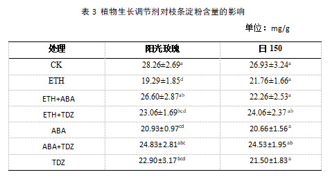 由表3可知,所有处理下‘阳光玫瑰’和‘日150’枝条中淀粉含量均低于对照。在‘阳光玫瑰’上,ETH处理的枝条淀粉含量较对照降低最多,为31.74%;其次为ABA、TDZ、ETH+TDZ和ABA+TDZ处理,分别较对照降低25.93%、18.96%、18.40%和12.13%;ETH+ABA处理后枝条淀粉含量较对照较低最少,为5.87%。在‘日150’上,ABA处理后枝条淀粉含量较对照降低最多,为23.28%;其次为TDZ、ETH、ETH+ABA和ETH+TDZ处理,分别较对照降低20.16%、19.19%、17.34%和10.65%;ABA+TDZ处理后枝条中淀粉含量较对照降低最少,为8.91%。说明在果实采收后,使用ABA处理后对‘阳光玫瑰’和‘日150’枝条淀粉含量的降低有促进作用,品种间存在差异。