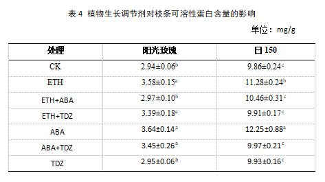 由表4可知,所有处理下‘阳光玫瑰’和‘日150’枝条蛋白质含量均较对照增加。在‘阳光玫瑰’上,ABA处理后枝条蛋白质含量较对照增加最多,为23.81%;其次为ETH、ABA+TDZ、ETH+TDZ和ETH+ABA处理,分别较对照增加21.77%、17.34%、15.30%和1.02%;TDZ处理后枝条蛋白质含量较对照增加最少,为0.34%。在‘日150’上,ABA处理下枝条蛋白质含量较对照增加最多,为24.23%;其次为ETH、ETH+ABA、ABA+TDZ和TDZ处理,分别较对照增加14.40%、6.08%、1.11%和0.71%;ETH+TDZ处理后枝条蛋白质含量较对照增加最少,为0.50%。说明在果实采收后,使用ABA处理后对‘阳光玫瑰’和‘日150’枝条的蛋白质含量增加均有促进作用。