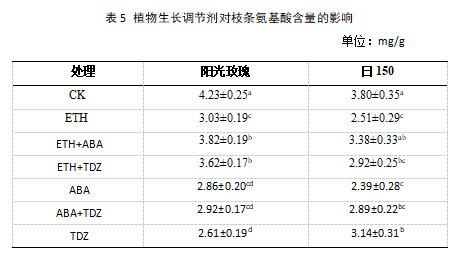 由表5可知,所有处理下‘阳光玫瑰’和‘日150’枝条中氨基酸含量均较对照降低。在‘阳光玫瑰’中,TDZ处理后枝条氨基酸含量较对照降低最多,为38.29%;其次为ABA、ABA+TDZ、ETH和ETH+TDZ处理,分别较对照较低32.38%、42.79、30.96%和14.42%;ETH+ABA处理后,枝条氨基酸含量较对照降低最少,为9.69%。;在‘日150’中,ABA处理后枝条氨基酸含量较对照降低最多,为37.10%;其次为ETH、ABA+TDZ、ETH+TDZ和TDZ处理,分别较对照降低33.94%、23.94%、23.15%和17.36%;ETH+ABA处理后,枝条氨基酸含量较对照降低最少,为11.05%。说明在果实采收后,使用ABA处理后对‘阳光玫瑰’和‘日150’枝条氨基酸含量的降低有促进作用,品种间存在差异。