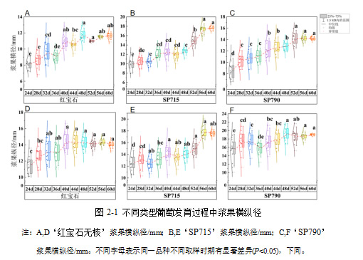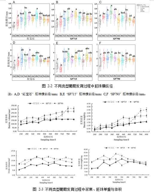 在采样期间,三个无核葡萄品种的浆果重量和体积,随时间的推移不断增加,结合浆果纵横径变化,整体呈上升趋势,无核葡萄由于出现种子败育现象,缩短了二次快速生长时期(图2-1)(图2-3)。随着三个无核葡萄的生长发育,其胚珠纵横径、单粒重与体积均在发育前期呈显著增加,达到较大值后趋于平缓,之后显著下降(图2-2)。‘红宝石无核’胚珠发育到48 d时,其纵横径、单粒重与体积均达到较大值;在44~52 d,大致维持稳定;52 d后下降。SP 715胚珠发育到48 d时,其纵横径及单粒重、体积均达到较大值;在40~ 48 d,大致维持稳定;48 d后下降。SP 790胚珠发育到36 d时,其纵横径及单粒重、体积均达到较大值;在32~ 40 d,大致维持稳定;40 d后下降(图2-2)(图2-3)。