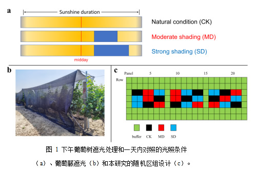 从开花到收获共设置两个处理。每天15:30(中午14:00)用黑色遮光网(宽3米,距地面2.5米,遮光率75%)对赤霞珠葡萄进行人工遮光,并在两个不同时间点移除遮光网恢复光照以抵御一天中的最高温度(图1a、1b)。对照(CK)葡萄自然生长,不进行人工遮光。中度遮光(MD)处理通过人工遮光网每天降低高温约1.5小时,强遮光(SD)处理则在午后高温时为葡萄遮光约2.5小时。采用完全随机区组设计,选取葡萄园中生长均匀的三行葡萄,作为三个生物学重复(图1c)。每个重复中,每个处理(CK、MD和SD)分配六个区组,中间以缓冲区隔开,以最大程度地减少边缘效应。每个区组由八株连续的葡萄藤组成,本研究共使用432株葡萄藤(3个重复×3个处理×6个区组×每区8株葡萄藤)。