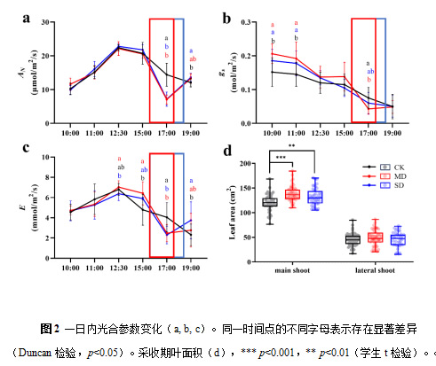 因此,本研究对半干旱地区的赤霞珠葡萄植株实施了午后遮荫处理。通过遮阳网进行人工遮荫,从当地时间15:30(太阳正午约在14:00)——即每日最高温临近时开始,直至两个不同时间点解除,处理期从花期持续至采收期。中度遮荫(MD)时长为1.5小时,强度遮荫(SD)为2.5小时。通过此设计,植株在日落前仍有机会接受光照。研究人员通过测定日光合能力、采收时叶面积等指标,解析葡萄藤对日内动态光环境的响应机制;同时结合果实挥发性物质、葡萄酒香气及感官评价,探究午后遮荫对葡萄与葡萄酒品质的影响。我们提出假说:午后遮荫虽会抑制葡萄藤光合作用,但重新光照可促使植株产生胁迫补偿效应,从而改善葡萄与葡萄酒品质。该研究结果不仅阐明了微气候光照管理的生化效应与感官后果,更有助于深化基于胁迫-恢复机制的生产策略,以提升半干旱地区葡萄与葡萄酒品质。