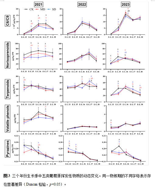 本研究综合分析了游离态和结合态挥发物,以评估午后遮荫对葡萄源香气化合物的整体影响。在五大类挥发物中(图3),游离态和结合态形式均被检出,但仅鉴定出游离态吡嗪类化合物。在生长季中,大多数挥发物类别在转色期前后达到峰值,随后在采收前逐渐下降。在所有挥发物中,C6/C9化合物是赤霞珠葡萄中最主要的挥发物类别。在果实发育早期(E-L 33、E-L 35)及首个试验年份,对照(CK)的C6/C9化合物含量较高;但遮荫果实在转色后积累加速,除2021年份外,采收时浓度均反超对照。降异戊二烯类物质呈现相似趋势,且在2021年份差异更为显著。2021与2022年份中,SD处理的萜烯类物质积累较CK延迟约一个物候期,而2023年份萜烯积累最为显著,MD与SD组均在转色期快速上升并持续维持较高水平。挥发性酚类在2021年CK中含量较高,但2022-2023年组间无显著差异。吡嗪类在葡萄挥发物中含量最低且生长期持续下降,SD组在2021和2023年份出现积累时序偏移,但三年间未呈现一致规律。