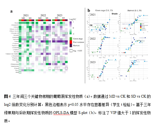 通过计算单个挥发物的log2倍数变化(MD/CK、SD/CK)发现(图4a),三年数据均显示绿果期MD与SD处理的C6/C9化合物浓度持续偏低,但采收期(尤其后两年)遮荫组反而更高。萜烯与降异戊二烯类在2021年绿果期呈显著低值,而2022-2023年遮荫果实的降异戊二烯浓度反超对照。基于OPLS-DA模型的S-plot分析(图4b)表明,2021年绿果期(E-L 33)几乎所有挥发物在CK中更丰富,但采收期遮荫果实中高含量化合物增多,提示遮荫果实成熟阶段部分挥发物加速积累。其余年份也观察到类似现象。逐年对比显示:采收期CK中高表达差异化合物(VIP>1)数量后两年较2021年减少,而遮荫果实中此类化合物数量逐年递增。此外,己醛、芳樟醇、β-大马士酮、6-甲基-5-庚烯-2-酮等生物标志物在多数发育阶段VIP值最高,被确定为关键差异物。