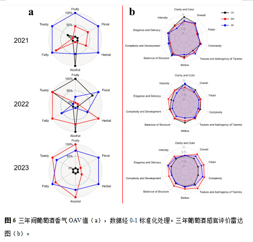 基于已发表阈值和描述符计算气味活性值(OAV)与香气系列,将OAV高于0.1的挥发物认定为香气贡献组分,归纳出果香、花香、青草香、醇香、脂肪味与烘烤香六类香气指标并进行标准化处理(图6a)。在果香与花香等愉悦香气方面,SD酒样连续三年均展现最突出的花香特征。果香虽在三年中波动较大,但除2022年外MD与SD酒样普遍优于CK。青草香与脂肪味则呈现一致性规律,遮荫酒样始终高于对照组,而烘烤香与醇香未发现稳定规律。