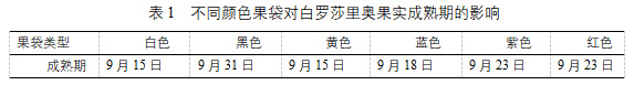 选用黑色(内黑外黄避光果袋)、白色、红色、紫色、蓝色、黄色六种不同颜色的纸袋为葡萄果穗套袋材料,以白色纸袋为对照。于花后50天随机选取大小较为一致的果穗进行套袋,各处理30穗,8月30日拆除果袋。调查不同处理果实的成熟期及各处理成熟期的果实大小和品质。