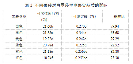 不同颜色纸袋对白罗莎里奥果实品质的影响见表3。从表3可见,不同颜色纸袋间果实可溶性固形物含量均存在显著性差异,其中黑色纸袋的可溶性固形物含量最高,红色纸袋的可溶性固形物含量最低,紫色、蓝色纸袋稍低于对照白色纸袋。就可滴定酸含量看,黑色纸袋果实可滴定酸含量显著高于其它纸袋,黄色、蓝色、紫色、红色纸袋果实可滴定酸含量均低于对照白色纸袋。就糖酸比看,蓝色纸袋果实糖酸比最高。