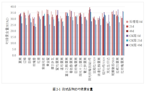 植株受盐碱胁迫后,其新梢节间长度会缩短,且生长点会褐化死亡,导致其新梢生长停滞甚至停止。从测试品种的相对生长量(表2-1)可以看出,随着盐碱液浓度的增加和胁迫时间的增加,不同品种的生长量呈现不同的趋势。