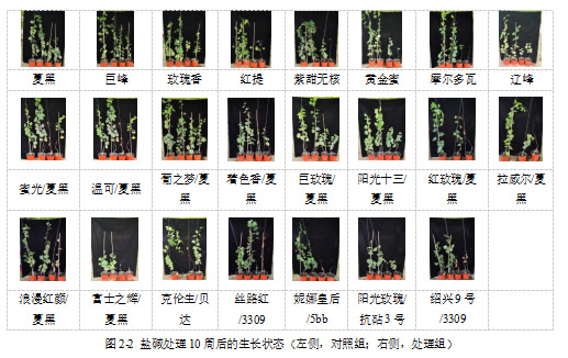 在盐碱处理第5周,与对照组植株相比,处理组植株新梢生长明显变慢,部分植株出现生长点黄化、节间变短、叶片失绿等盐碱危害症状。随后几周,茎尖枯死,叶片黄化直至脱落,生长停止。至第10周,处理组植株出现较多叶片完全脱落甚至植株死亡的情况;而对照组植株叶片数量多且长势仍较好,仅个别植株出现少量黄化叶片(图2-2)。处理组中,巨峰、夏黑、辽峰、蜜光/夏黑、温可/夏黑、巨玫瑰/夏黑、阳光十三/夏黑、葡之梦/夏黑的植株相对其他测试品种死亡较少。