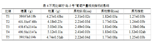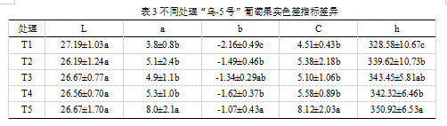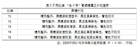 由图1和表2可知,5个膨果处理果穗整体均较整齐,除T1处理外,其他4各处理果穗较近密,存在果粒变形的不足,GA3浓度≤50mg/L时对果实着色没有显著影响,果皮均呈该品种固有的紫黑色,果穗着色均匀,当浓度≥75mg/L时,果皮呈红黑色至紫红色,果穗出现着色不一致的问题。