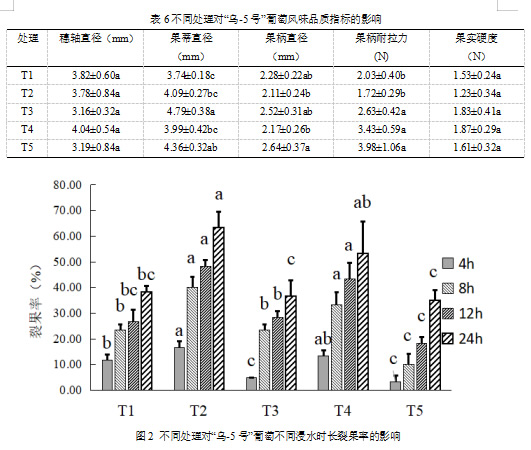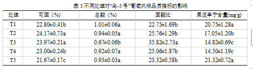 综合分析认为,引进品种乌5号,宜在采用留穗尖果穗整形,满花期2 mg/LCPPU膨果的基础之上,采用 50mg/L GA3+1mg/L CPPU进行膨果处理,穗形整齐,呈该品种固有的紫黑色,着色均匀,粒重达5g以上,固酸比35.82,果皮单宁含量最低14.82,果皮涩味最轻,果柄耐拉力和果实硬度最高,综合化品质最优。5个膨果处理果穗整体呈现较紧凑的状态,高浓度下出现果粒变形和田间裂果率高的问题,后续还需进一步开展花前拉穗浓度筛选,同时进一步开展不同调节剂处理对制干品质的影响,以期进一步完善该品种的花果管理技术。