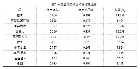 以穗重、可溶性固形物、果实硬度、固酸比、果柄耐拉力和粒重等 6个指标为正向指标,以果皮单宁含量、色差值a、总酸含量和4h浸泡裂果率等4个指标为负向指标,采用熵值法进行综合评价。权重系数由高到低依次为:固酸比(16.358%)>穗重(14.851%)>总酸(11.510%)>果柄耐拉力(10.923%)>单宁含量(9.924%)>4 h裂果率(8.445%)>果实硬度(8.396%)>粒重(7.524%)>可溶性固形物(6.494%)>a值(5.575%)。其中,固酸比权重最大,a值权重最小。