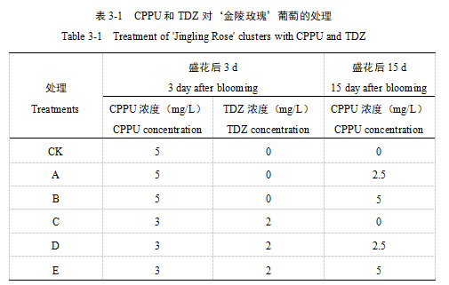 选取生长状况相对一致的3株‘金陵玫瑰’葡萄树为供试材料,前期采取相同的管理方式:每个结果枝只保留靠近基部的一个花穗,花穗整形时保留穗尖3 cm。以田间常规处理(盛花后3天20 mg/L GA3 + 5 mg/L CPPU,盛花后15天25 mg/L GA3)为对照,第一次处理于盛花后3天(2023年5月17日)进行,各处理统一施用20 mg/L GA3,在此基础上添加不同浓度CPPU与TDZ;第二次处理于盛花后15天(2023年5月29日)进行,各处理统一施用25 mg/L GA3,在此基础上添加不同浓度CPPU。采用随机区组排列,不同处理的果穗随机分布在3株树上,每个处理3个重复,共45穗葡萄。采取统一肥、水、病虫害管理以控制非试验因素造成的误差影响。试验处理详见表3-1。