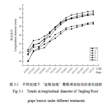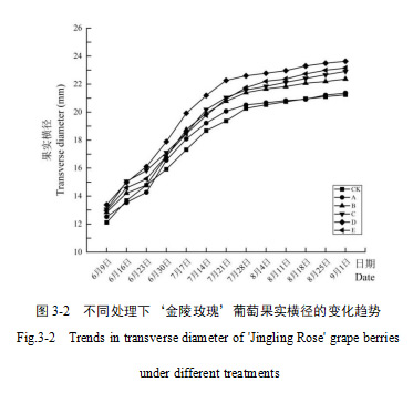 如图3-1所示,对照果实纵径在6月9日至6月16日迅速增加,此后虽然增速略有下降,但仍保持了线性递增趋势,进入8月份后果实纵径的增长速度明显减慢,并逐渐趋近于稳定状态。处理A、B、D、E的果实纵径变化趋势均呈双S曲线,第一个快速增长期在6月9日至6月16日,第二个快速增长期在6月23日至7月28日。处理C的果实纵径在6月9日至6月16日迅速增加,6月16日至6月30日增长缓慢,6月30日至7月28日间又迅速增长,而后增速降低直至果实纵径趋于稳定。在整个生长发育过程中,对照和处理C的果实纵径相较于其他处理组均表现出较低的水平,生长前期对照的果实纵径高于处理C,在7月7日后处理C的果实纵径超过对照,表明TDZ主要在果实发育的后期拉长果实纵径。