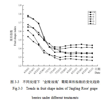 如图3-3所示,各处理下果形指数的变化大致相同,总体呈现先降低后趋于稳定的趋势。其中对照、处理A和B果实果形指数的快速降低阶段在6月9日至7月14日,处理C、D、E果实果形指数的快速降低阶段在6月9日至7月21日。处理C、处理D的果形指数在果实的整个生长发育期内均处于较低水平,且成熟期果形指数在1.3左右,表明在GA3浓度相同时,盛花后3天混合使用CPPU和TDZ能有效降低果形指数,使果实形状趋向椭圆形。