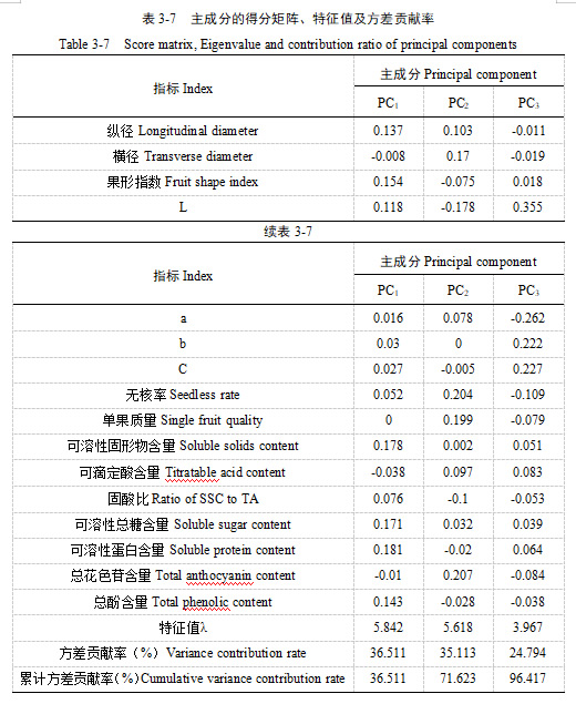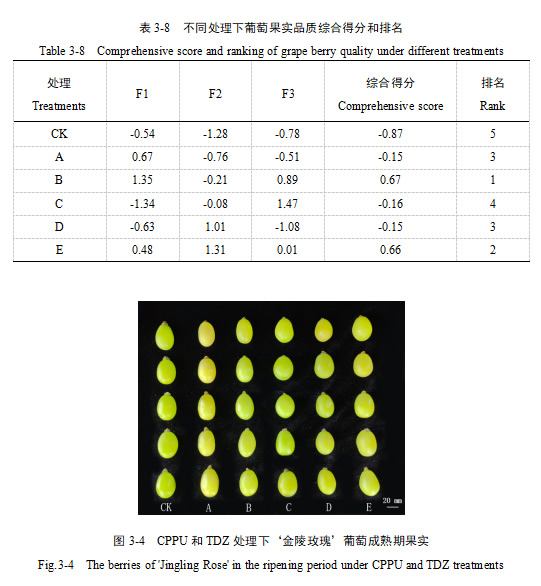 如表3-7所示,对不同处理下成熟期果实的16个品质指标进行主成分分析,共提取出3个特征值>1的主成分PC1、PC2、PC3,方差贡献率依次为36.511%、35.113%和24.794%,累计方差贡献率达到96.417%,说明这3个主成分能够反应16个成熟期果实指标的绝大部分信息。可溶性蛋白含量、可溶性固形物含量、可溶性总糖含量、果形指数、总酚含量和果实纵径6个指标对第一主成分有较高贡献;总花色苷含量、无核率、单果质量、果实横径、固酸比和可滴定酸含量6个指标对第二主成分有较高贡献;果皮色差L、a、b、C值4个指标对第三主成分有较高贡献。如表3-8所示,B处理下成熟期果实综合品质得分最高,其次是处理E,处理D和处理A的成熟期果实综合品质相当,CK的成熟期果实综合品质最差。