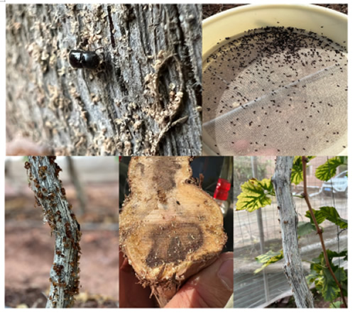 本次调研发现西昌市川兴镇克伦森葡萄上小蠹为害较重。川兴镇葡萄种植面积8000亩中1500余亩受害,每2亩范围内3天可积累诱剂数千头小蠹,单株枝干(主干、主蔓或较粗的枝条)蛀孔总数达到30-200个。该虫的蛀孔直径约1-2毫米,孔外形成细条状或牙签状的“木粉条”或“树胶条”,剖开可以看到深入木质部的复杂隧道,隧道周围的木材会被共生真菌染成深褐色或黑色。植株被侵蚀后树势衰弱,养分供给不足,叶片出现缺素症状(缺镁、缺铁等多种元素),果实出现品质下降、上色更晚、更易脱粒。该虫体长2mm左右,身体短粗、呈圆筒状,体表光滑、有光泽、呈深褐色至黑色,头部从背面看是不可见的、完全被前胸背板所覆盖,鞘翅末端钝圆并向下倾斜的。从形态特征确定,该虫疑似光滑足距小蠹(Xylosandrus germanus)或其同属近缘种(图2)。