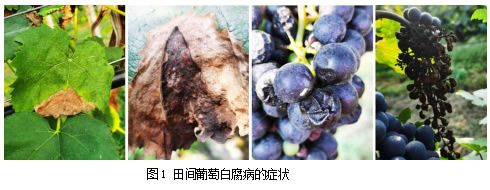 葡萄白腐病病原菌主要危害果穗,也危害新梢、叶片等部位。果穗发病,初期果粒基部产生淡褐色水浸状病斑,病斑逐渐扩大,变褐腐烂,使果粒变褐软烂,果面密布灰色小粒点。严重时全穗腐烂,病果干缩,形成僵果。葡萄白腐病菌主要以菌丝体、分生孢子、分生孢子器随病株残体在土壤中或地表越冬。越冬后的病菌在次年夏天降雨后,病菌产生大量的分生孢子,通过飞溅的雨水进行传播,通过伤口或气孔进入葡萄枝条、叶片、果穗等部位引起初侵染,发病的植株在温湿度合适时迅速萌发,造成再次侵染[3]。