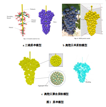 以马瑟兰为主要研究对象,测定了葡萄果串的几何和物理特性及力学参数。记录不同成熟度下的FDF与FBF变化。在Creo软件中建立了三维果串模型(图1a),并在EDEM平台上采用 Bonding V2 粘结模型构建柔性离散元模型(图1b),准确模拟果粒与果梗的连接、受力与断裂过程;通过参数标定法实验确定关键参数,保证模型的精度。此外研究还尝试了果粒多球聚合模型(图1c),该模型在理论上具有更好的反映果粒内部的受力,具有更高的精度。