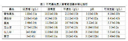 每个基地分别采收30 kg,除梗,粒选机粒选后破碎,压榨取清汁分别置于3个5 L发酵罐,加硫60 ppm,放置4℃冷库低温静置24 h,取上清,按0.3 g/L添加活化ADT酵母(上海鼎唐国际贸易有限公司),15~18℃控温发酵,待比重降至1.00以下且不再发生变化后酒精发酵结束,放置4℃冷库静置分层,取上清调硫待测。