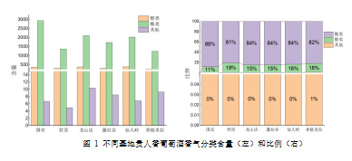 各基地贵人香葡萄酒香气含量比例上,均以酯类为主,国宾的酯类比例最高,达到89%,君顶最低81%,醇类比例君顶最高19%,萜烯等其他类香格里拉最高0.6%,君顶和香格里拉贵人香葡萄酒香气比例相对均衡。