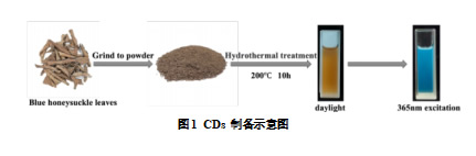 在本研究中,CDs 是利用蓝靛果的废弃落叶研磨成粉末后通过水热法制备获得的,图 1 为 CDs 的制备方法示意图。CDs 溶液在室内光线下为浅黄色透明溶液,在 365 nm 紫外灯照射下发出蓝色荧光。