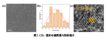 如图 2a 的 TEM 分析显示,所制备的 CDs 具有均匀的球形或近球形结构,粒径分布均匀,直径小于 5 nm,平均直径为 2.6 nm(图 2b)且具有良好的分散性和清晰的晶格,晶格间距为 0.184 nm(图 2c),符合纳米粒子的一般特征。TEM 图像揭示了这些 CDs 的良好分散性,这对于其与植物细胞的相互作用具有重要意义。