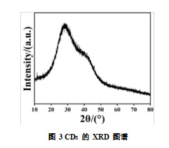 为了鉴定 CDs 材料的晶型,对 CDs 进行 XRD 分析,如图 3 所示。XRD 分析表明,所制备的 CDs 主要呈现无定形结构,在 XRD 图谱中 28.79。处显示出一个宽广的衍射峰,位于 2θ 约为 20-30°的范围内。这一结果表明,制备过程中的 CDs 未形成明显的结晶结构,而是表现出非晶态特征。