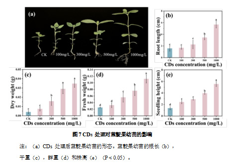以蓝靛果种子幼苗为研究对象,采用 0、100、300、500、1000 mg/L CDs 进行叶面喷施处理。试验结果表明,与对照组相比,CDs 处理能够促进幼苗的生长,且表现出浓度依赖性。如图 7a 所示,随着 CDs 浓度的增加,幼苗的植株高度明显提高,叶片面积增大,叶片数量增加,同时根系长度增长,根毛更加密集。其中,1000 mg/L CDs 处理的促进效果最为显著,根长增加 2.6 倍(260.3%)(图 7b),干重和鲜重分别提升 7.7 倍(766.8%)(图 7c)和 3.4 倍(342.2%)(图 7d),苗高较对照组增加 3.11 倍(311.1%)(图 7e)。这些结果表明,适宜浓度的 CDs 能够显著增强蓝靛果幼苗的生长势,提高其地上部分和地下部分的生物量积累。