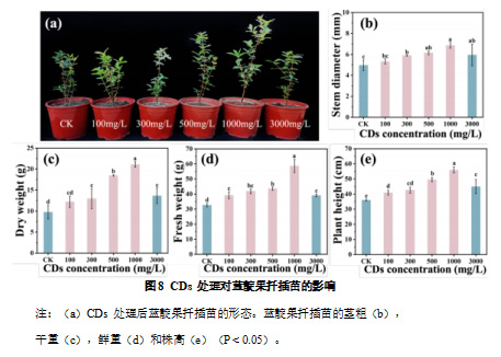 然而,当 CDs 浓度提高至 3000 mg/L 时,虽也显著促进了蓝靛果扦插苗的生长,与对照组相比茎粗增加 19.81%,干重提升 40.12%,鲜重提高 19.77%,株高增加 24.91%。但与 1000 mg/L 的 CDs 溶液处理相比,扦插苗的茎粗减少 15.41%、干重减少 54.72%,鲜重减少 50.16%、株高降低 24.39%。