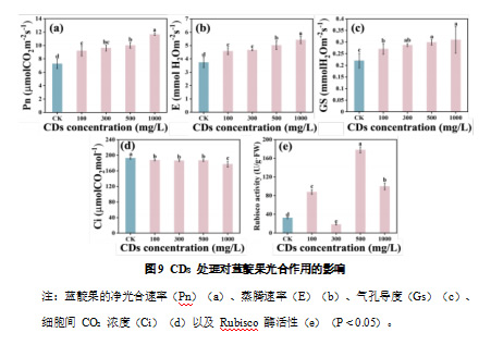 进一步探讨 CDs 对植物碳固定过程的影响,本研究测定了 Rubisco 酶活性。结果显示,CDs 处理显著提高了 Rubisco 酶的活性。与对照组相比,100 mg/L、500 mg/L和 1000 mg/L CDs 处理分别使 Rubisco 酶活性提高了 170.99%、449.6%和 208.12%,其中 500 mg/L CDs 处理的促进作用最显著(图 9e)。