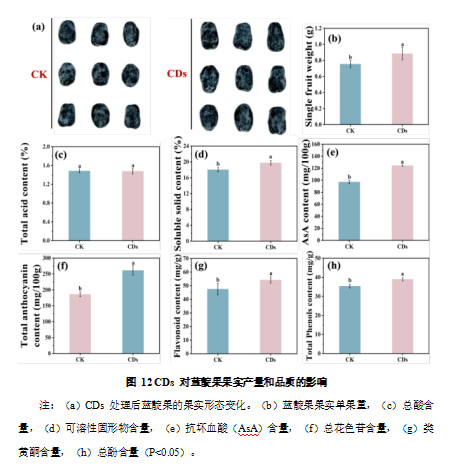 如图 12a 所示,CDs 处理显著促进了蓝靛果果实的生长发育,使果实个体大小较对照组明显增大。单果重显著增加了 17.2%,达到 0.88 g(图 12b)。由于果实大小和重量通常与最终产量密切相关,因此推测 CDs 处理可能进一步提高蓝靛果的整体果实产量。在果实品质方面,可溶性固形物含量在 CDs 处理后显著提高,较对照组增加 9.6%(图 12d)。可溶性固形物主要包括糖类、酸类和其他风味物质,通常用于衡量果实的甜度。CDs 处理显著提高了蓝靛果果实中可溶性固形物含量,表明果实的甜度有所增强。而总酸含量未发生显著变化(图12c),这表明 CDs 处理可能通过提高糖酸比来增强果实的甜味,而非单纯降低果酸含量。此外,抗坏血酸(AsA)含量在 CDs 处理后显著提升,较对照组增加 28.07%(图 12e),表明 CDs 处理能够提高蓝靛果果实的营养价值。在次生代谢产物方面,CDs 处理显著提高了蓝靛果果实中花色苷、黄酮类化合物及总酚含量(图12 f, g, h)。与对照组相比,CDs 处理后果实中花色苷含量增加了 40.39%,黄酮含量增加了 14.04%,总酚含量提升了10.28%。花色苷、黄酮和总酚均为重要的抗氧化物质,在植物抗氧化防御系统中发挥关键作用,同时对果实的色泽、风味及保健功能具有重要影响。