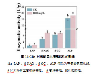 土壤酶活性是衡量土壤生物活性及其生态功能的重要指标,在养分循环和有机物分解过程中起关键作用。如图 13 所示,与对照组(CK)相比,CDs 处理显著提高了土壤中各类酶的活性。其中,LAP、 β-NAG 、β-GC 和 ALP 的活性分别提高了 30.7%、69.0%、12.6% 和 4.9%。LAP 与 β-NAG 均与土壤氮循环密切相关,其中 β-NAG 的活性增幅最大,表明 CDs 处理可能增强了土壤微生物对氮源的分解利用能力。β-GC 作为碳循环关键酶,其活性的提高反映了 CDs 处理对土壤有机碳分解过程的促进作用。