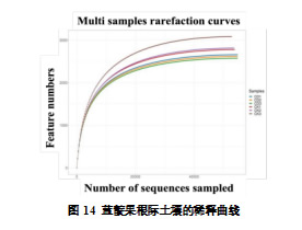 为了全面解析 CDs 对根际微生物群落的影响,本研究利用 Illumina NovaSeq 高通量测序技术,对 6 份根际土壤样本(两组试验处理)进行了 16S rRNA V3-V4 区测序。测序共获得479,623 条原始序列,在质量控制和去噪后,最终保留 330,051 条高质量序列。这些序列被归类为 12,808 个 OTUs,其中 CDs 处理组(CD)包含 8,671 个 OTUs,而对照组(CK)仅包含 7,854 个 OTUs。如图 14 的稀释曲线分析表明,随着测序深度的增加,曲线趋于平稳,表明本研究的测序数据已经充分覆盖了样本中的微生物多样性。