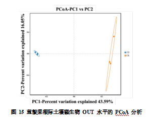 为进一步探讨 CDs 处理对根际土壤微生物群落结构的影响,本研究基于 OTU 水平进行了主坐标分析(PCoA)。如图 15 所示,PC1 和 PC2 分别解释了样本群落结构变异的 43.59% 和 16.05%。PC1 主导了样本间的主要变化趋势,对照组(CK)样本聚集在 PC1 轴的右侧,而 CDs 处理组(CD)样本则聚集在左侧,且两组样本之间的置信区间无重叠。这一结果表明,CDs 处理后,蓝靛果根际土壤微生物群落的组成发生了显著变化,与对照组相比形成了明显的分化。此外,CDs 处理组的样本聚类更紧密,表明该处理组内的群落结构较为稳定,变异性低于对照组。