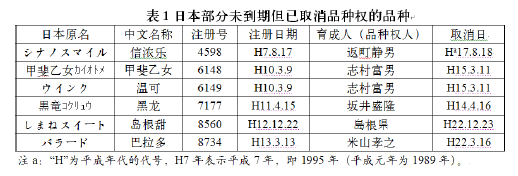 注册后到目前尚未到期(1995 年以后注册的)的品种共有66个, 有20个已经提前取消保护,其中在中国比较知名的品种见表1。