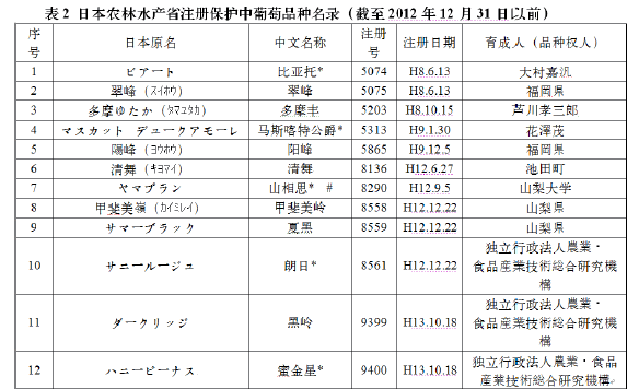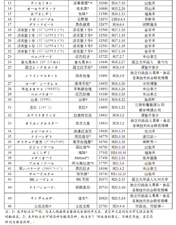 日本农林水产省于1978年颁布《种子法》并实施,从1980年开始了植物品种权申请与注册,保护期限一般为18年,最长的有30年(酿酒葡萄一般申请时都是25-30 年)。最早获得品种权的葡萄品种是‘伊豆锦’(イズこシキ),于1980年3月31日注册。从1980年到2012年年底,在日本农林水产省注册的葡萄品种总数达到155个。以平成元年(1989年)为分界线, 1980-1988年9年间注册品种有50 个,1989年-2012年24年间注册的有105个。保护期内随时可以自动放弃品种权,所以很多推广不好的品种都在保护期内放弃权利,其中保护期最短的是1995年3月23日注册的‘旦峰’(清水 一选育), 于2年后的1997年3月25日放弃权利,注册后未到期但自动放弃品种权的品种有72个,著名的粉红亚都蜜(矢富萝莎)于1990年注册,于2002年提前终止保护,类似的还有天秀、新马特等。目前已经期满的品种(1994年以前注册的品种)有33个,包括藤稔、奥山红宝石(红意大利)、哈尼无核、金手指、高妻、白萝莎等。至于国内最著名的‘美人指’则没有在注册登记表中找到。